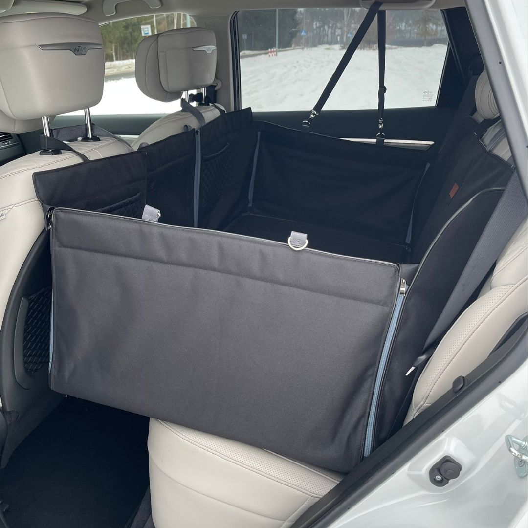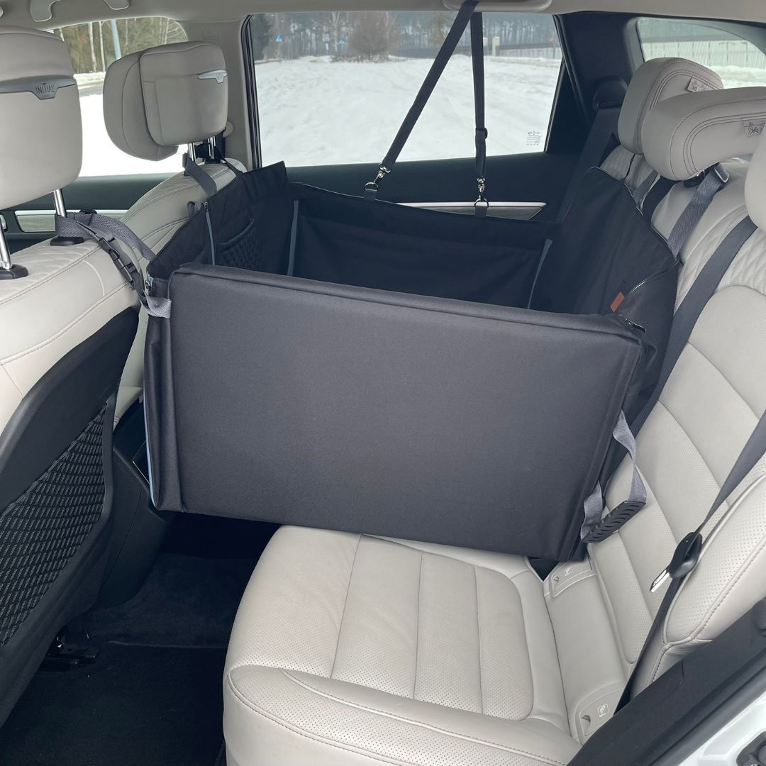 Mata samochodowa ze sztywną podłogą na całą tylną kanapę. Sztywna podłoga jest trójdzielna, co ułatwia jej składanie. Mata posiada okienko i rozpinaną przednią ścianę. Po rozpięciu przedniej ściany można ustawić w pionie prawą lub lewą część podłogi tak, aby usiąść obok psa.  Mata samochodowa ze sztywną podłogą może służyć wówczas jako mata na 2/3 tylnej kanapy. Część usztywnionej podłogi podniesiona do pionu działa wtedy jako przegroda miedzy psem a pasażerem.